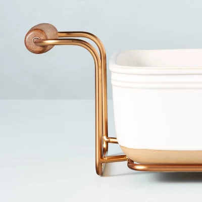This Oven-to-Table Stoneware Baking Dish with Cradle Carrier from Hearth & Hand™ with Magnolia makes entertaining friends and family simply beautiful. Bake your favorite casserole in this oven-safe rectangular dish and then simply place it in the cradle carrier to display and serve. The wooden handles make for easy carrying from oven to table. The two-tone baking dish is crafted from timeless stoneware for a decorative and functional essential you’ll want to keep in your kitchen for years to come.