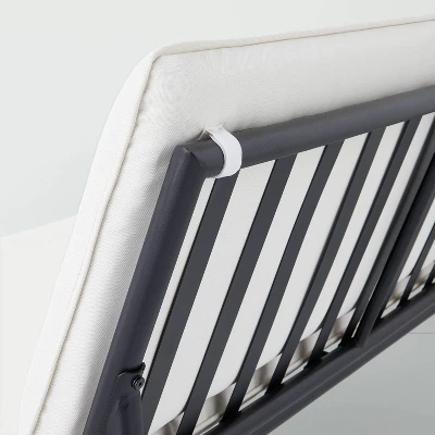 Lounge in comfort and style by sitting on this Cushioned Metal Outdoor Loveseat from Hearth & Hand™ with Magnolia. Designed with a metal frame, this sleek loveseat features a slatted back with slightly tapered legs and a round knob-like base. The removable cream cushion complements the black metal construction for a modern look while adding comfort to this metal-frame loveseat. Use this weather-resistant loveseat in your outdoor space, and add a round slatted table to complete your outdoor setup in elegant style.